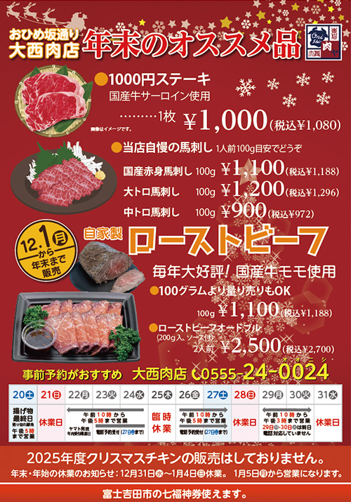 年末・年始の休業のお知らせ:12月31日水〜1月4日日休業。 1月5日月から営業になります。
